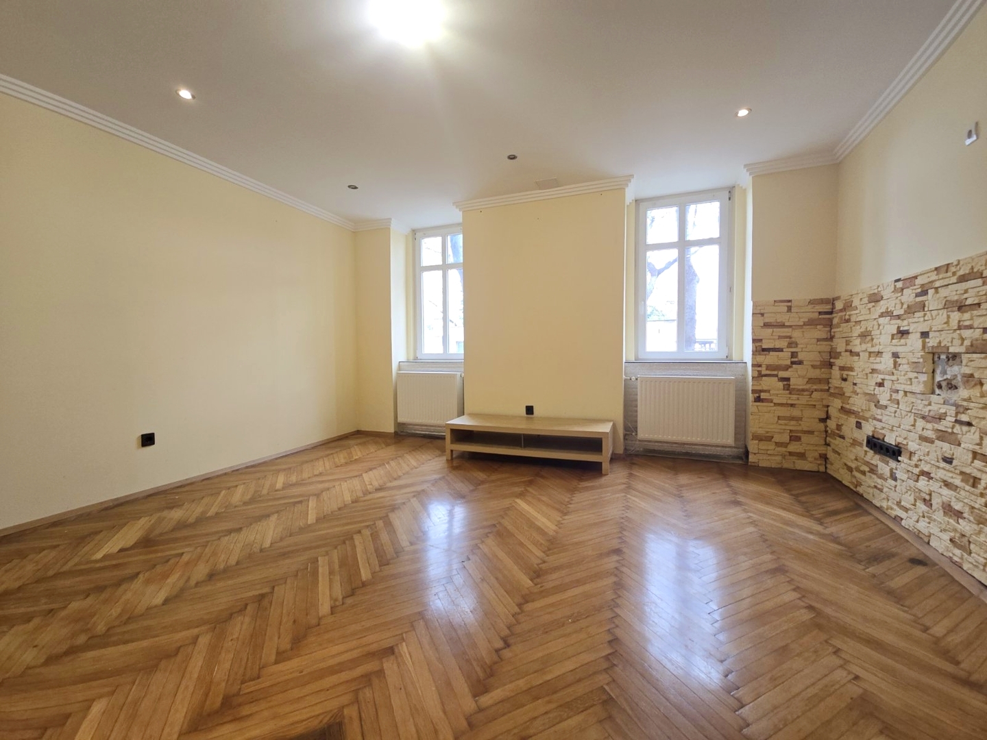 Az ingatlan két tágas szobával, külön konyha-étkezővel rendelkezik, amelyből kamra és egy további félszoba is nyílik, valamint egy kádas, WC-s fürdőszoba található benne. Az elrendezés jól kihasználható, így családok számára, irodának és befektetésnek is ideális.
